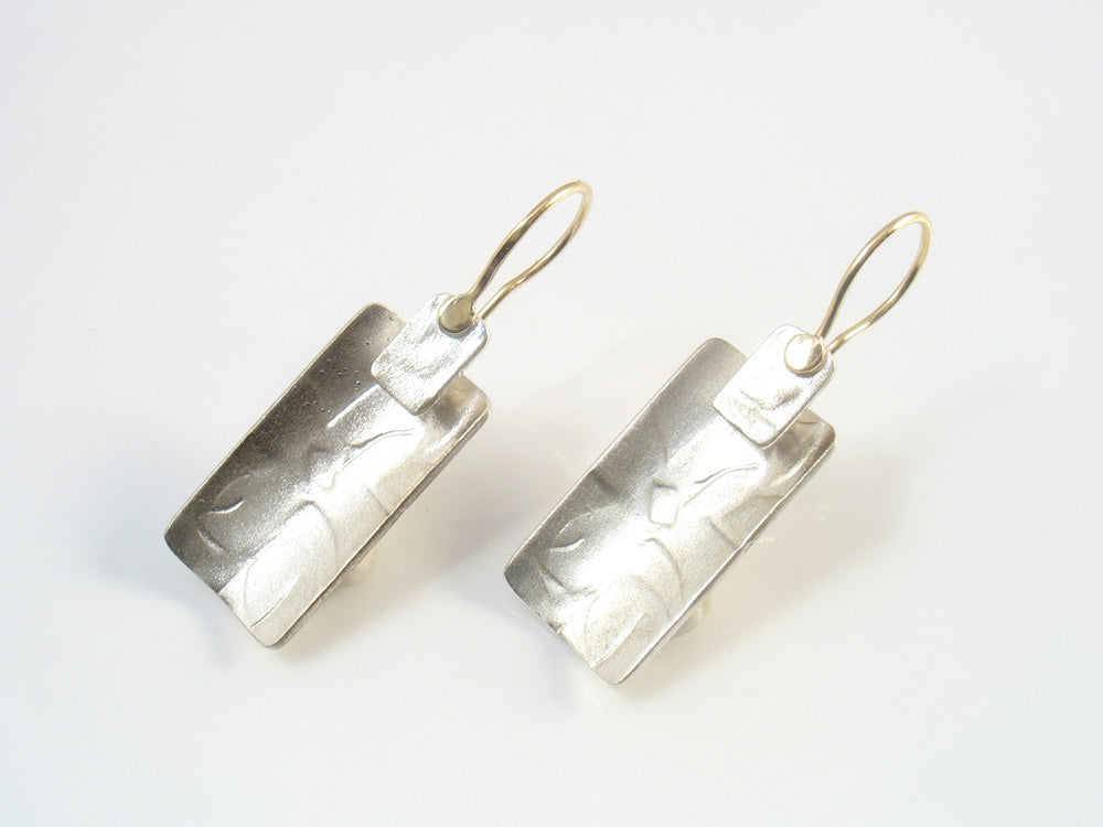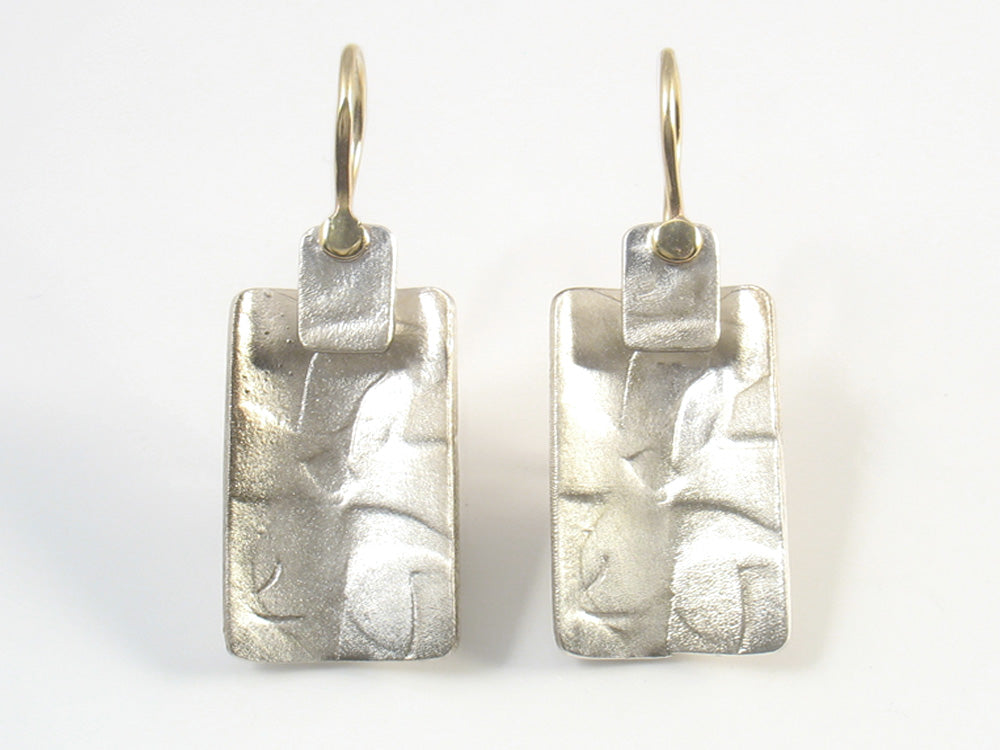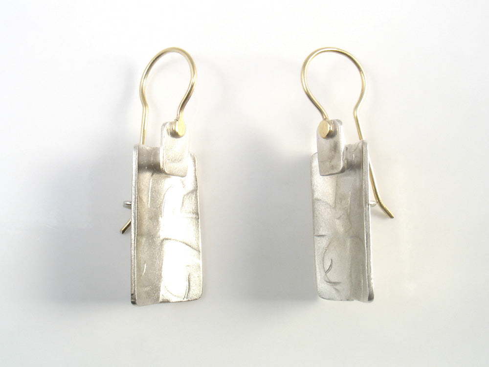 3D architectural textured rectangular earrings, brush finished on gold wire.