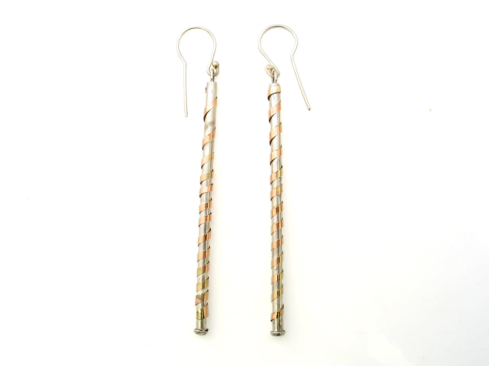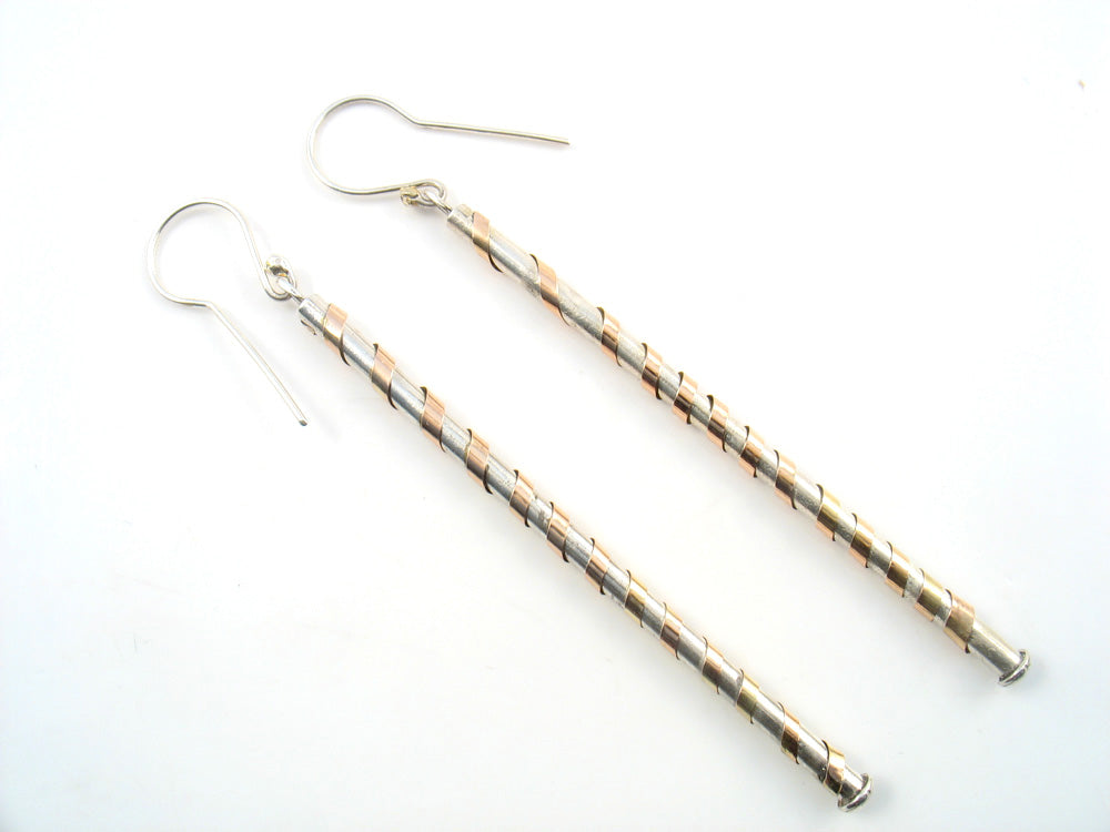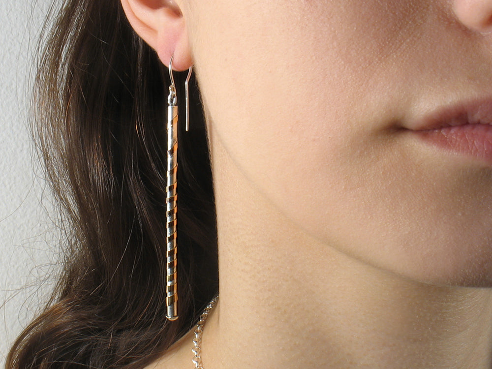 3mm silver bar, 6.5 cm in length, wrapped by a rose gold strap and dangling off a hook.