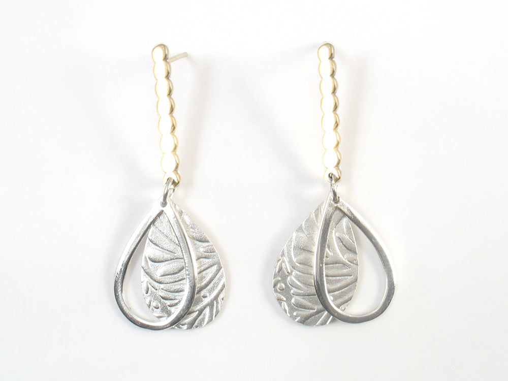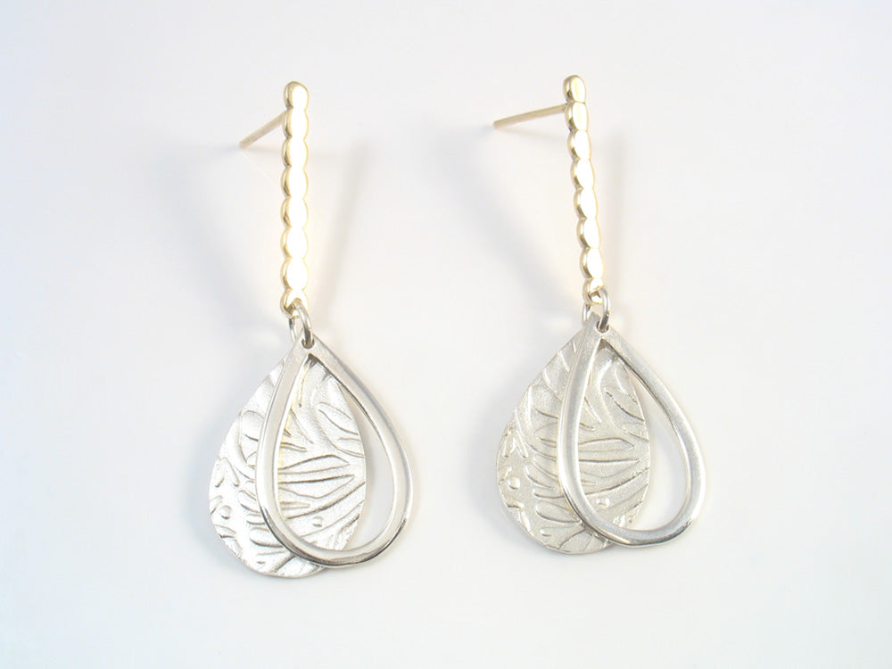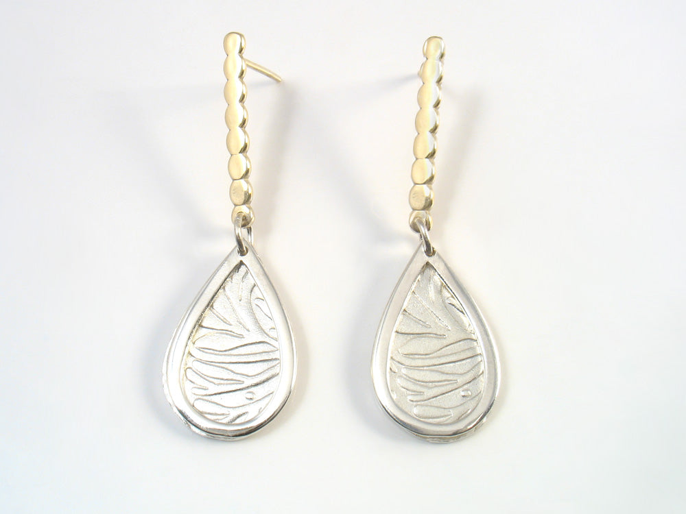 Brushed Sterling silver drop with a leaf texture, framed by a shiny Sterling drop contour, connected to a polished gold bar made of 8 gold balls soldered and flattened together, connected to a gold post.