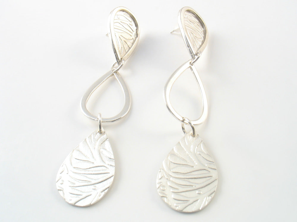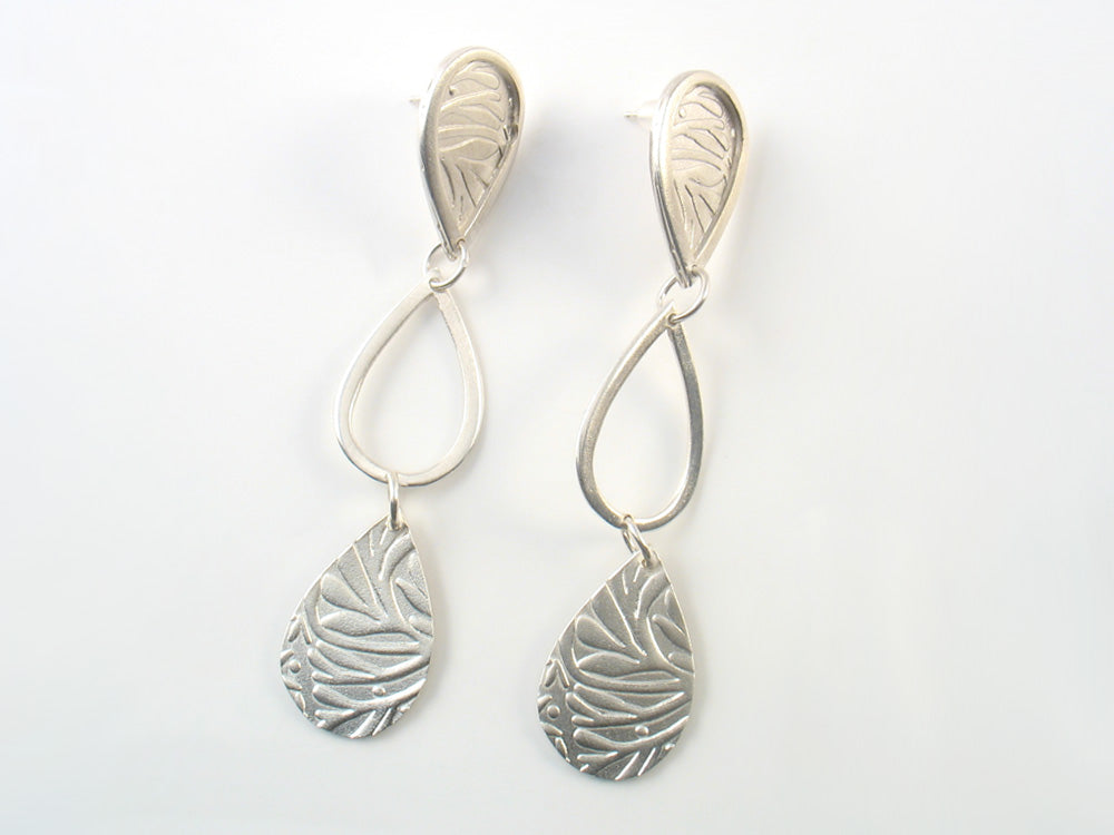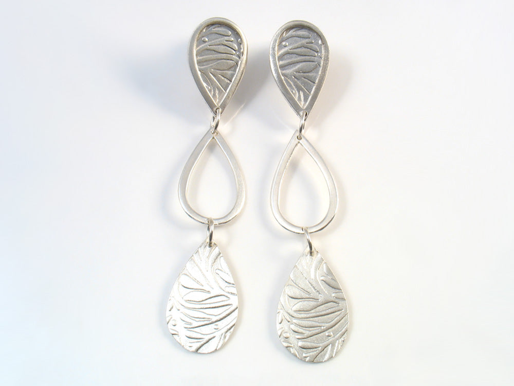 Long partly brushed Sterling silver stud earrings made of three different styles of tear drops.