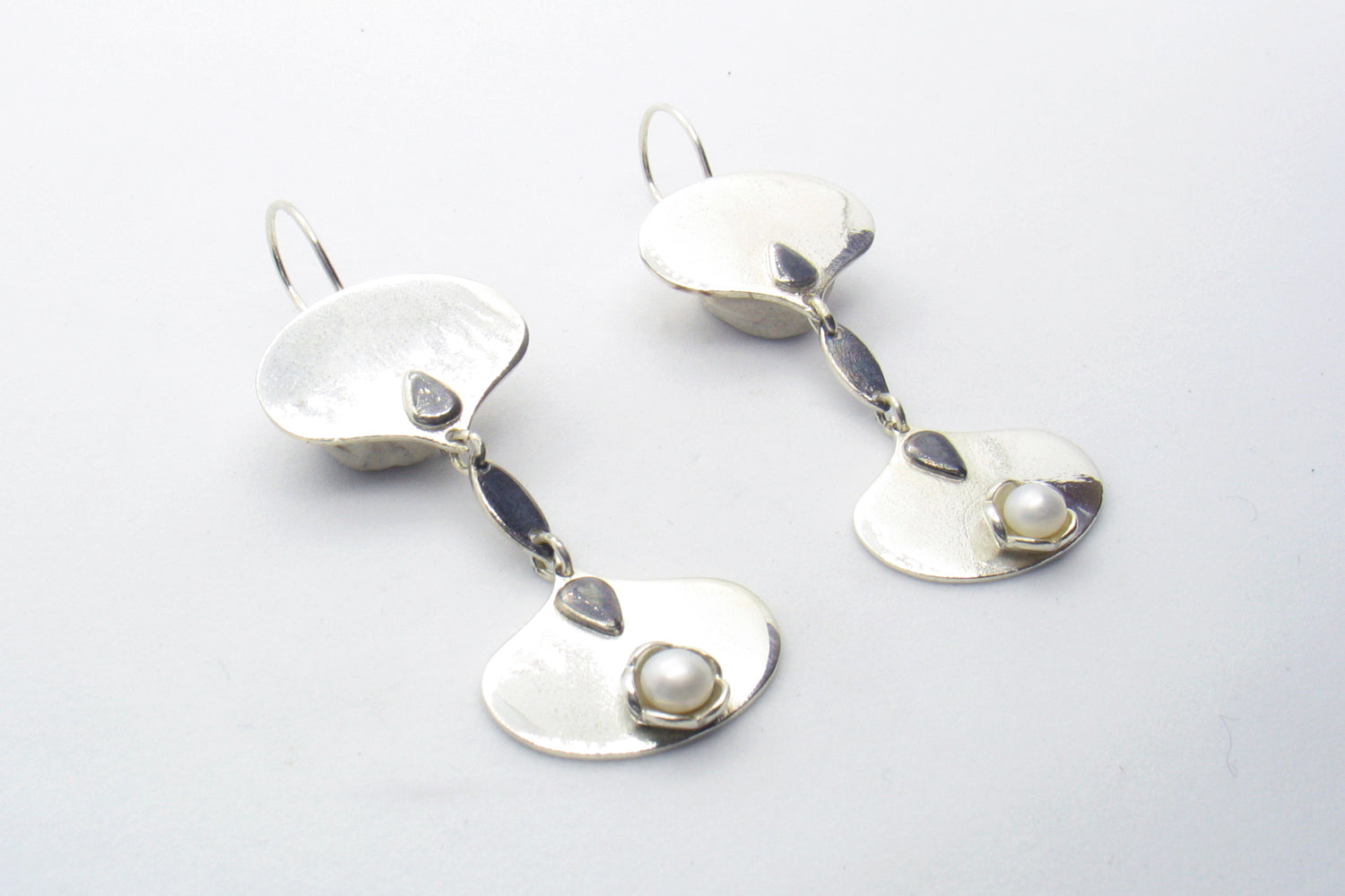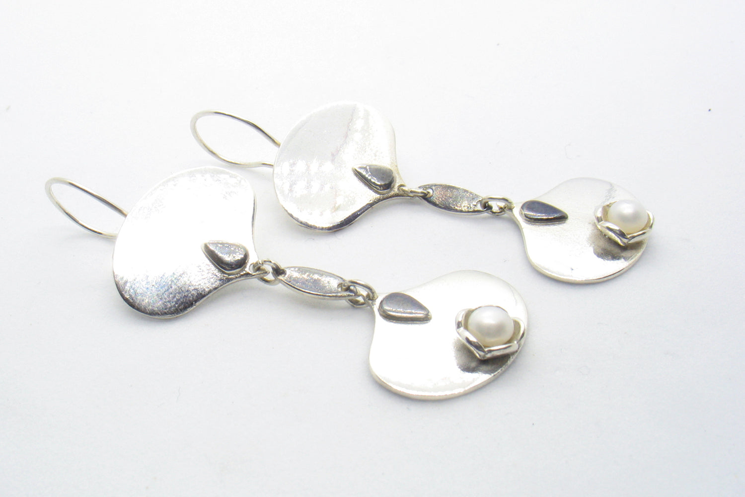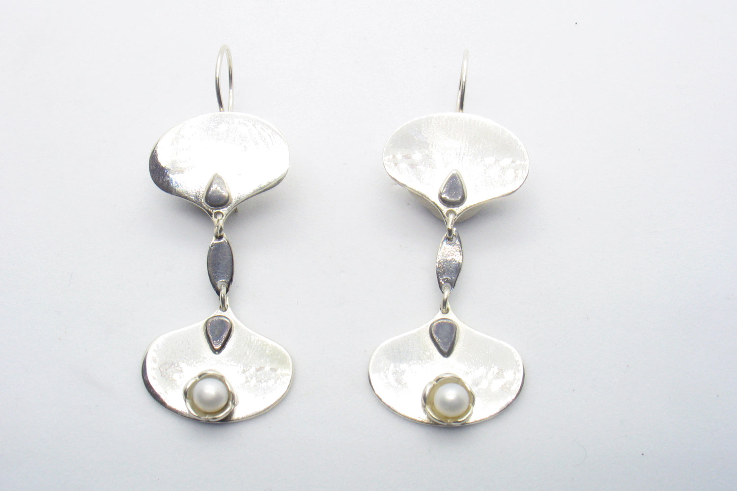 Inspired by the Spanish hand held fan, we created a few new earring sterling silver designs, and this is the first one – the double fan! Sterling silver decorated with a fresh water pearl at the bottom, this dangly pair catches the light beautifully no matter which direction it's facing! Part of our 2020 collection.