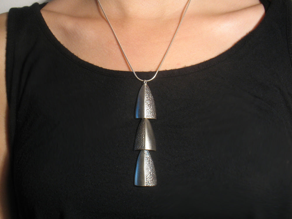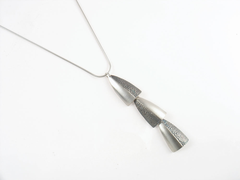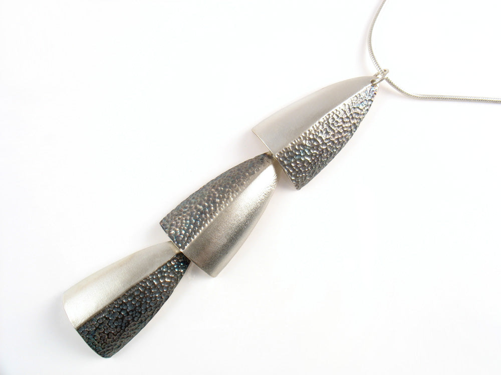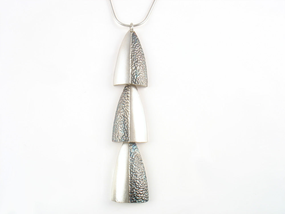 Sterling silver tribal shield, half hammered and half brush finish. Each is 3.5 cm length and the entire pendant is 10.5 cm on 16 inch snake silver chain
