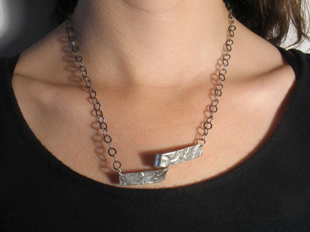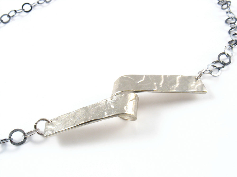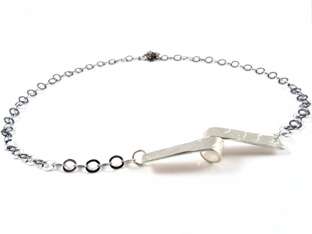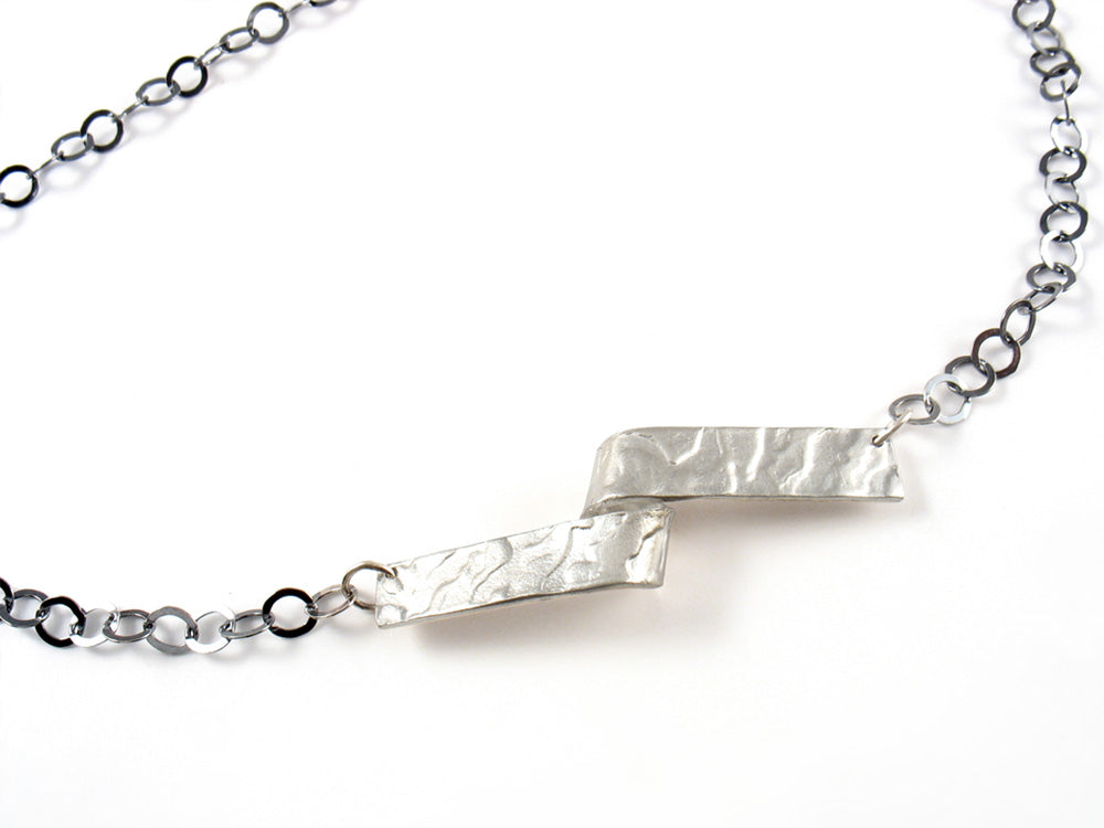 Brushed and textures sterling silver half knot hold on both ends with oxidized flat rings chain.