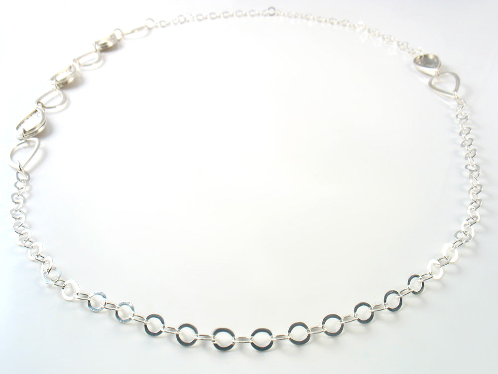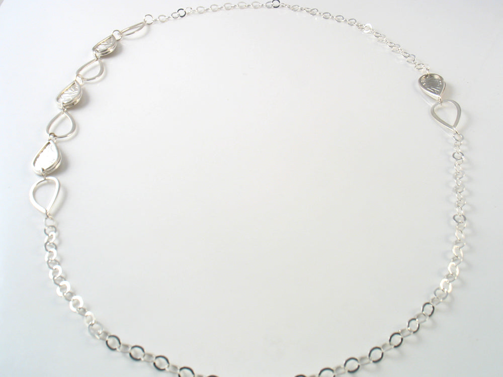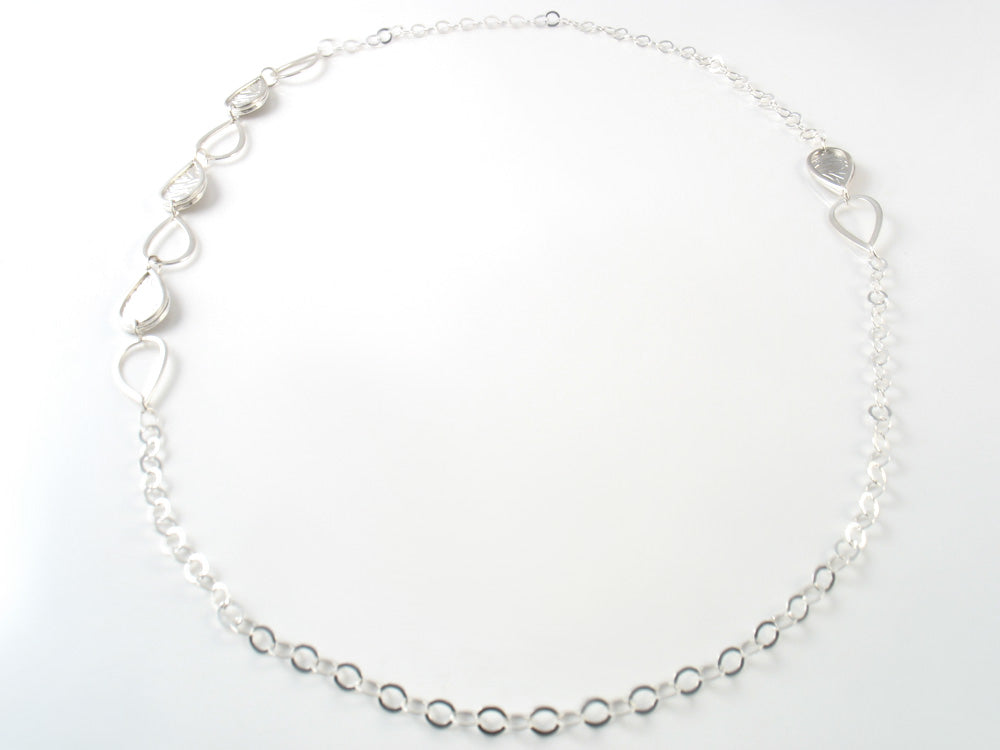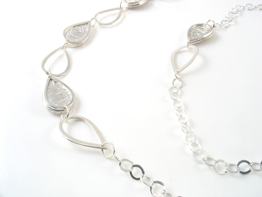 Endless sterling silver necklace, roughly 70cm in length, made out of textured and hollow tear drops, connected in two different spots by a flat ring chain.
