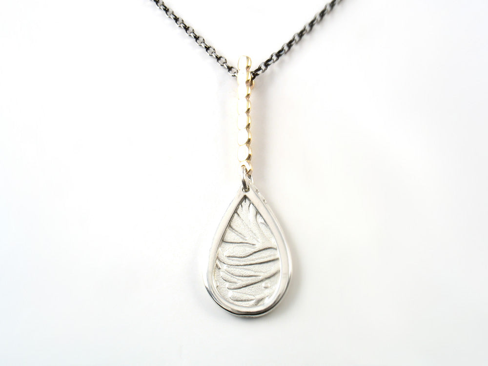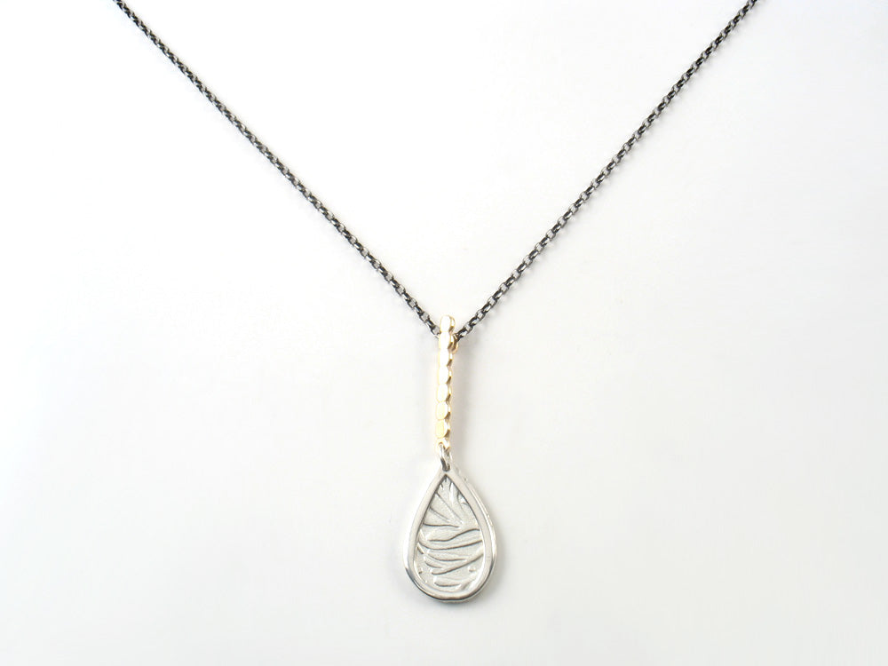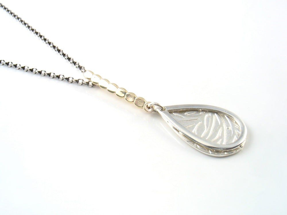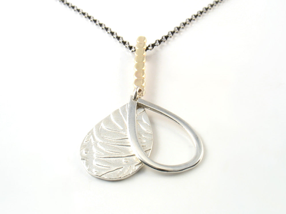 Brushed Sterling silver drop with a leaf texture, framed by a shiny Sterling silver drop contour, connected to a polished gold bar made of 8 gold balls soldered and flattened together, on a 16 inch oxidized rolo silver chain.