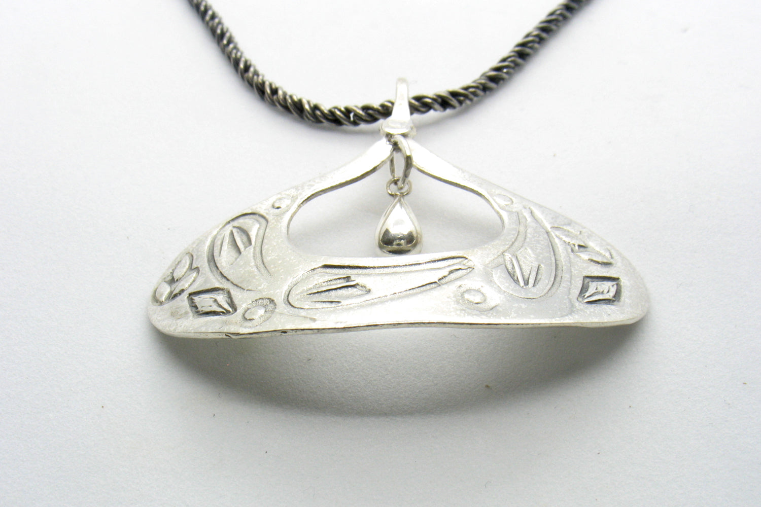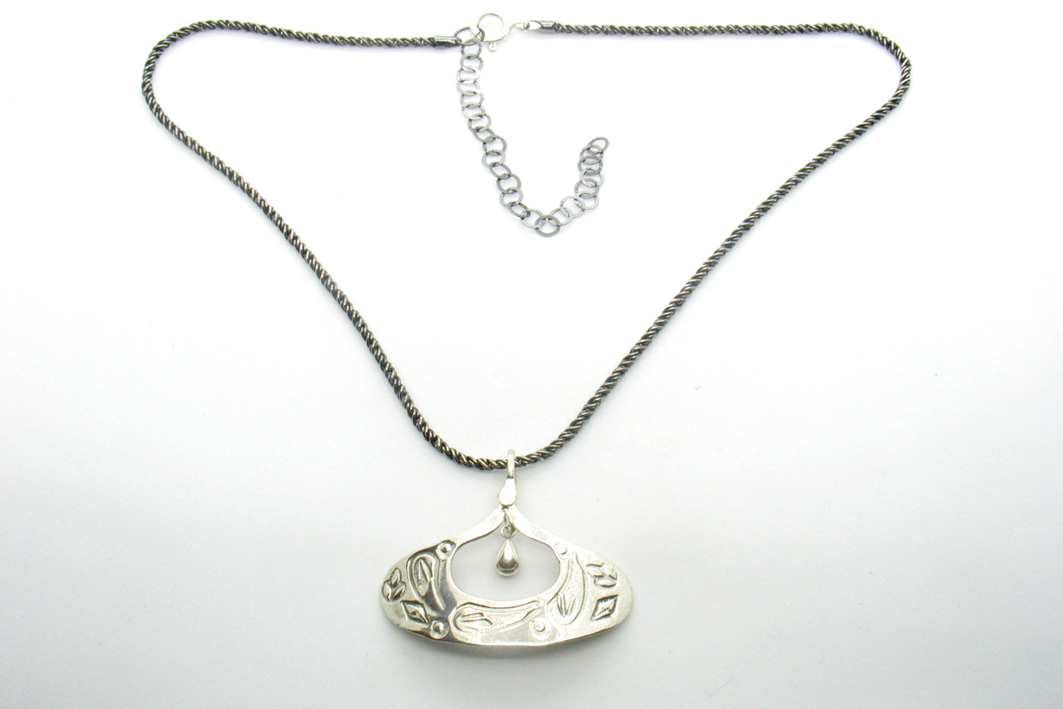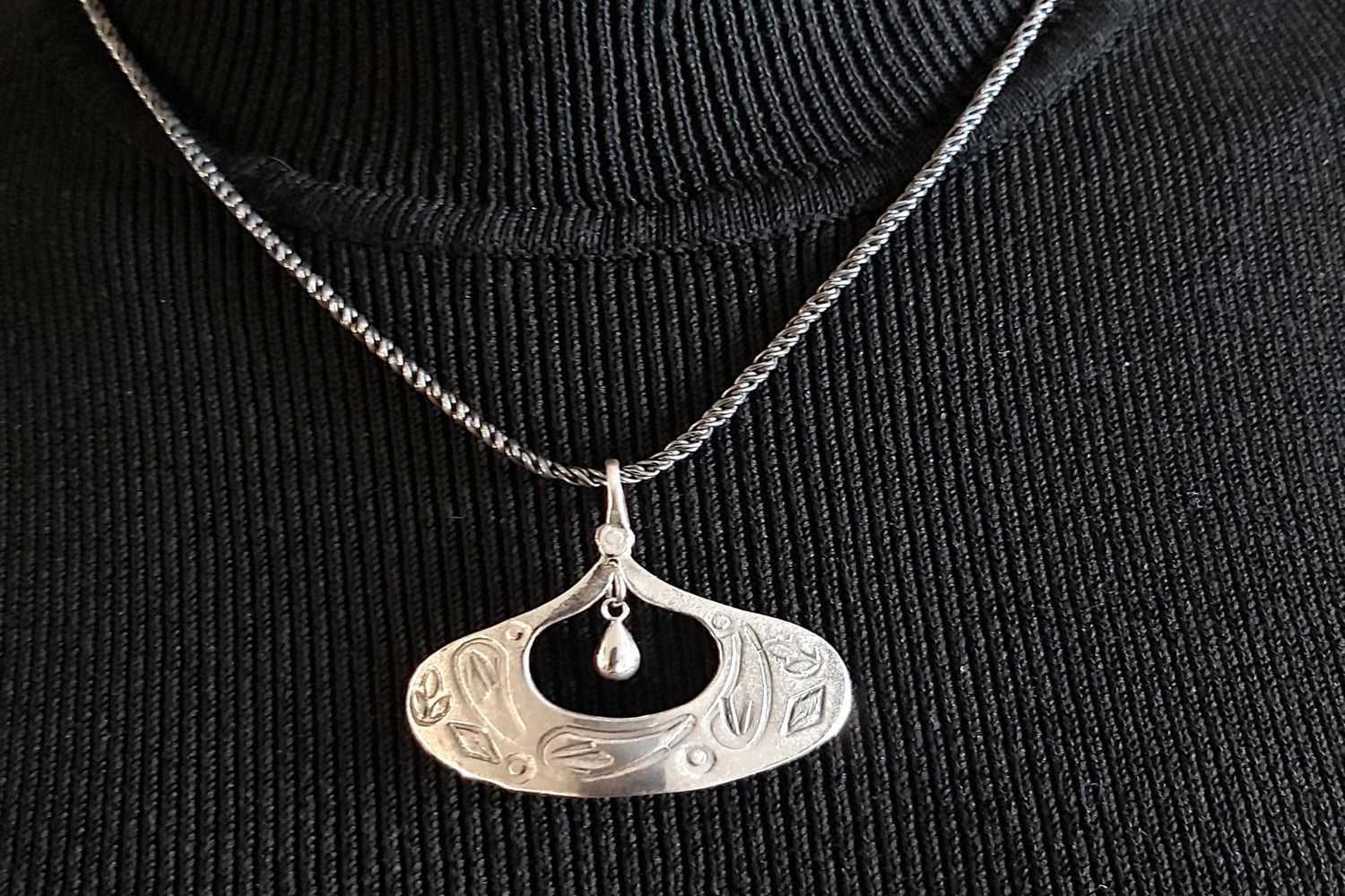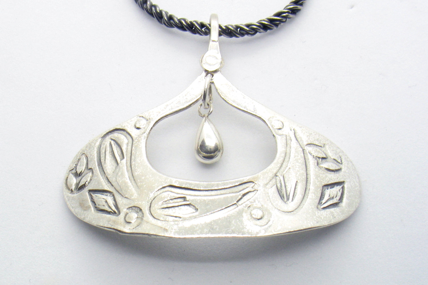 This is the pendant from our Spanish Hand Held Fan collection! Sterling silver upside-down fan, stamped and oxidized to highlight the designs on the silver, suspended from a beautiful oxidized silver braid chain.