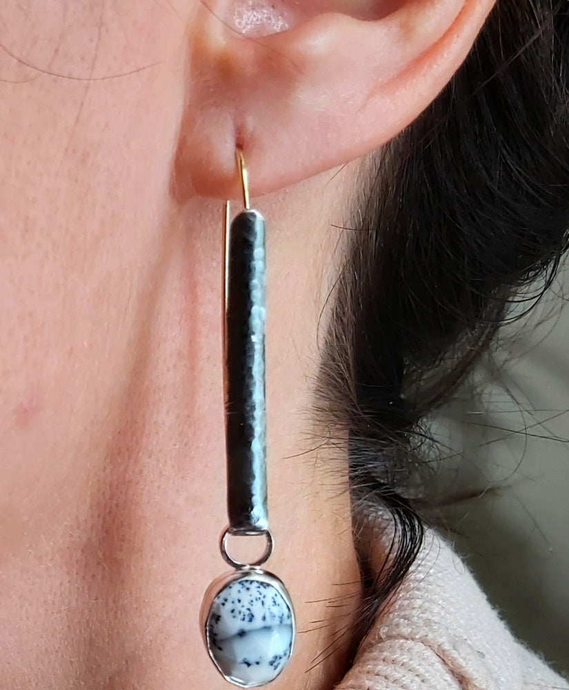 An oval faceted rose cut dendrite opal set in sterling silver. Stones dangle from a hammered silver oxidized bar, Ear wires made of gold.