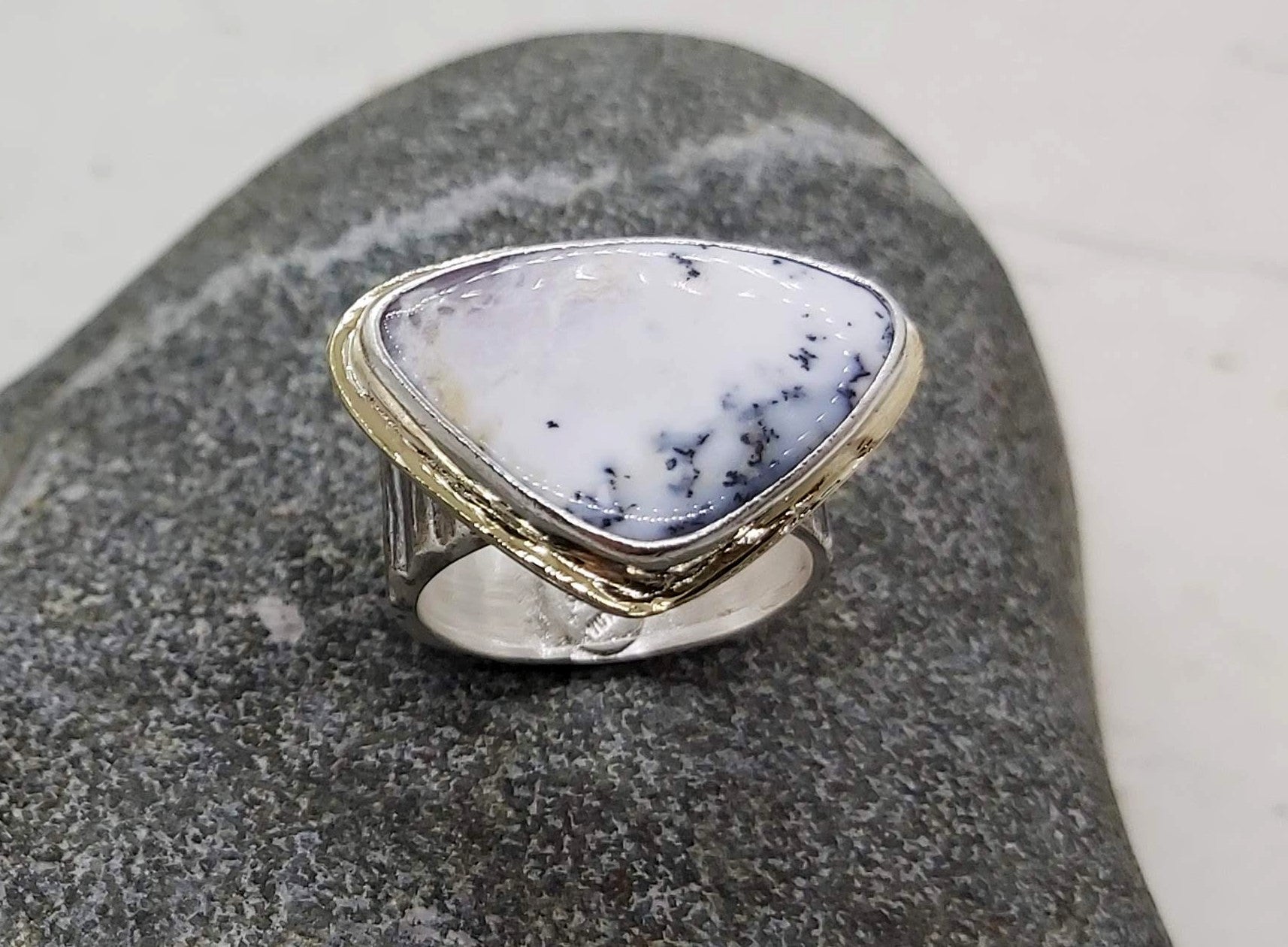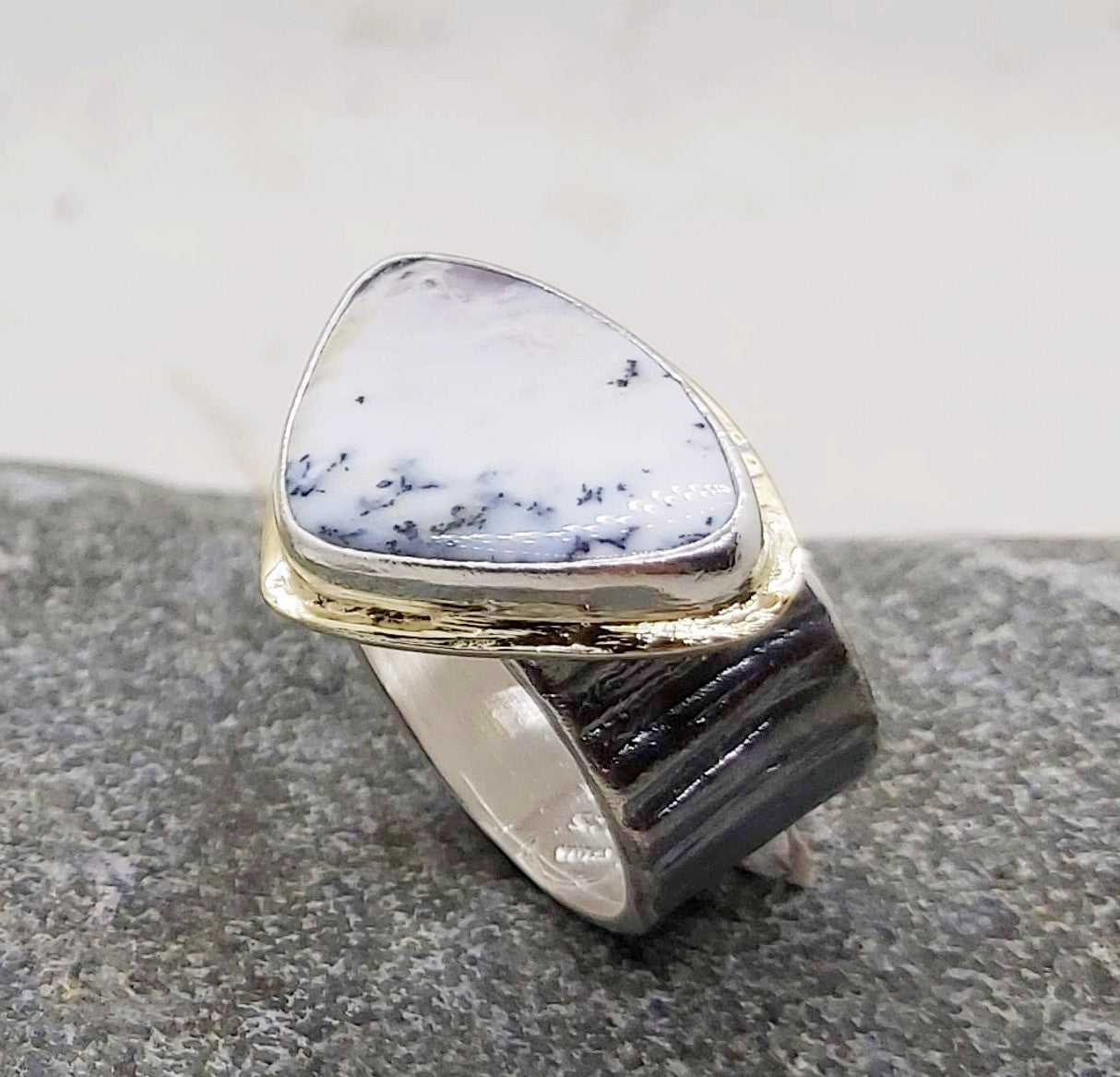 Triangle Opal dendrite cabochon ring in silver and gold, size 7.25